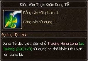 Muốn khắc Điêu Văn lên trang bị, bằng hữu mang Điêu Văn và trang bị tương ứng cùng đạo cụ Điêu Văn Thực Khắc Dung Tễ (mua tại Tiệm Nguyên Bảo hoặc nhận được khi tham gia phụ bản Thập Nhị Sát Tinh) đến tìm đại sư Trương Hàng Long để Điêu Văn Thực Khắc.