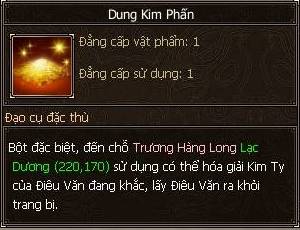 Để Tháo Điêu Văn, bằng hữu mang trang bị đã được Điêu Văn và đạo cụ Dung Kim Phấn (mua tại Tiệm Nguyên Bảo hoặc nhận được khi tham gia phụ bản Thập Nhị Sát Tinh) đến tìm Trương Hàng Long, ông ta sẽ giúp bằng hữu thực hiện công đoạn này.