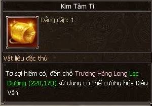 Để Cường Hóa Điêu Văn, bằng hữu mang trang bị đã được điêu văn cùng Kim Tàm Ti đến tìm Trương Hàng Long, ông ta sẽ giúp bằng hữu Cường Hóa. Kim Tàm Ti có thể nhận được khi tham gia phụ bản Tô Châu Liên Hoàn hoặc hoạt động Kính Hồ Lục Bá.