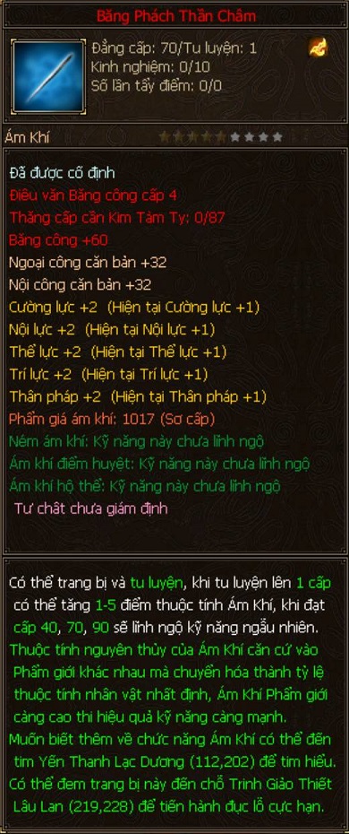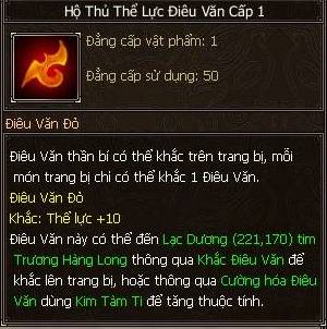 -Điêu Văn Đỏ: tăng các loại thuộc tính cơ bản cho nhân vật như Cường Lực, Nội Lực, Thể Lực, Trí Lực, Thân Pháp.