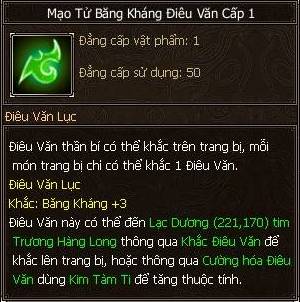 -Điêu Văn Xanh Lá (Lục): tăng các loại kháng tính cho nhân vật như Kháng Băng, Kháng Hỏa, Kháng Huyền, Kháng Độc.