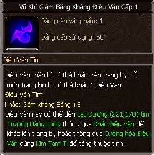 -Điêu Văn Tím: tăng các loại thuộc tính giảm kháng cho nhân vật như Giảm Kháng Băng, Giảm Kháng Hỏa, Giảm Kháng Huyền, Giảm Kháng Độc.