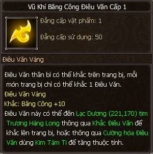 -Điêu Văn Vàng: tăng các loại thuộc tính tấn công cho nhân vật như Băng Công, Hỏa Công, Huyền Công, Độc Công.