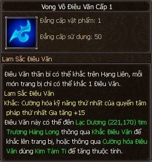 Điêu Văn sau khi tháo khỏi trang bị vẫn sẽ giữ nguyên đẳng cấp hiện tại và những chỉ số sau khi đã được Cường Hóa. Điêu Văn khi tháo khỏi trang bị sẽ cố định.