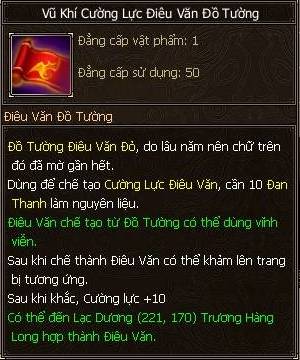 Cường Hóa Điêu Văn có tỷ lệ thành công đến 100%, bằng hữu muốn Cường Hóa lên cấp mấy thì chỉ cần mang đủ số lượng Kim Tàm Ti cần thiết được báo trên trang bị điêu văn của bằng hữu.
