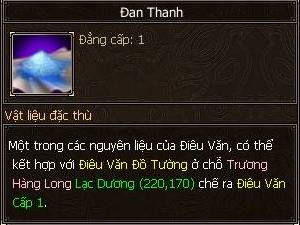 Nguyên liệu phụ để hợp thành Điêu Văn thông thường là Hoàng Chỉ và Đan Thanh. Bằng hữu có thể tìm thấy Đan Thanh tại thương tiệm Điêu Văn Công Năng trong Tiền Trang hoặc nhận được khi tham gia phụ bản Tàng Kinh Các.
